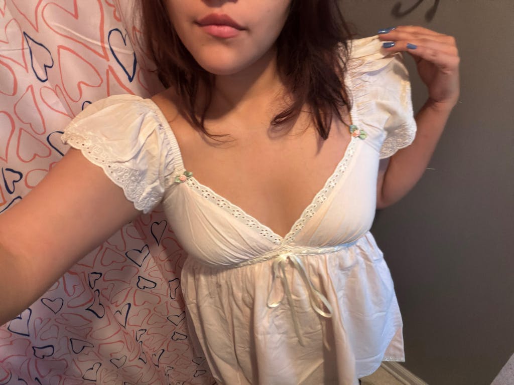 Soft, airy, and endlessly romantic. Cotton minidress with flutter sleeves, scalloped lace trim, and tiny rosettes at the neckline. The empire waist ties with a pretty satin ribbon bow and the babydoll skirt drapes with a nice full flowy fit. A side zipper gets you in easily. Pretty and comfortable - like wearing a daydream.