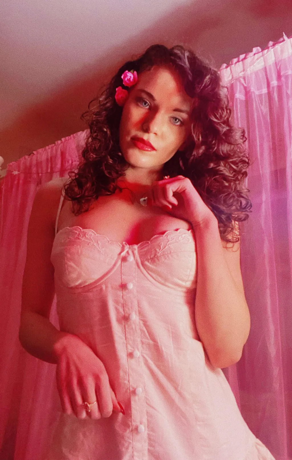 Romance in a dress ~ a fitted mini dress with a flouncy tiered ruffle skirt ending in a contrast white scalloped edge. Pretty rose embroidery on cups, and cups are topped with a scalloped edge as well. Cups are fully lined with a layer inside to give a flattering shape and support. Buttons down front, corset lacing in back for a secure fit, and back zipper to get you in easily. Straps adjust with heart sliders.